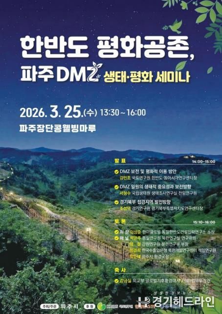 [경기헤드라인=김홍량 기자] 파주시는 오는 25일 13시부터 16시까지 파주장단콩웰빙마루(탄현면 필승로 396) 2층에서 ‘한반도 평화공존, 파주 디엠지(DMZ) 생태·평화 세미나’를 개최한다.