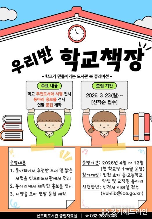 [경기헤드라인=문수철 기자] 인천광역시교육청신트리도서관은 인천 관내 중·고등학교를 대상으로 ‘우리반 학교책장’ 의 참가 동아리를 3월 23일부터 모집한다.