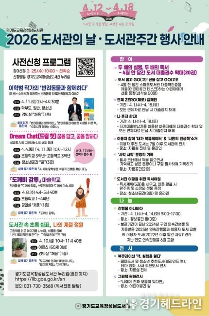 [경기헤드라인=문수철 기자] 경기도교육청성남도서관이 2026년 도서관의 날(4월 12일)과 도서관 주간(4월 12일~18일)을 맞아 다양한 독서·문화행사를 운영한다.
