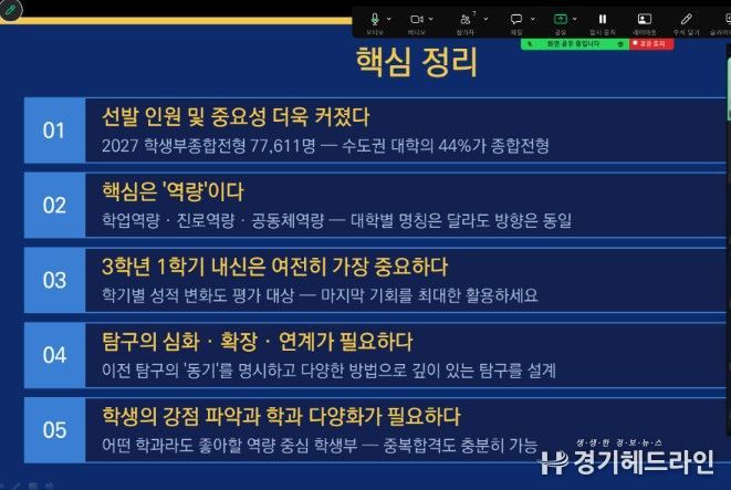 컨설팅은 고등학교 3학년을 대상으로, 좋은일코칭연구소 김병식 대표와 함께 진행했다. 이날 학생들에게 2027학년도 대입 학생부 종합 전형의 특성과 대학 평가 시스템 등을 이해하기 쉽게 설명했다.