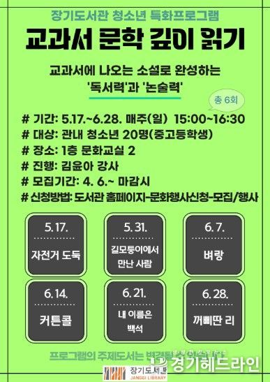 [경기헤드라인=문수철 기자] 김포시 장기도서관은 청소년의 독서력과 논술력 향상을 위해 '교과서 문학 깊이 읽기' 프로그램을 오는 5월 17일부터 6월 28일까지 진행한다.