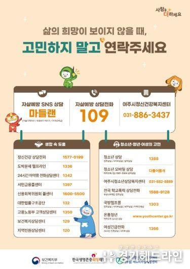 한편, 여주시민은 우울이나 불안 등으로 전문가의 도움이 필요한 경우 자살예방상담전화(109), 정신건강상담전화, 자살예방SNS상담 ‘마들랜’, 여주시정신건강복지센터(부설)자살예방센터를 통해 상담을 받을 수 있다.