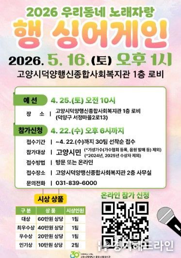 노래자랑은 고양시에 거주하는 시민이라면 누구나 지원이 가능하며 오는 22일까지 온오프라인 중 편한 방법으로 신청하면 된다. 온라인은 관련 링크로 접속해 신청하고 되고, 오프라인은 행신종합사회복지관 2층 사무실에 방문해 신청서류(이름, 주소, 신청곡 등)를 작성·제출하면 된다.