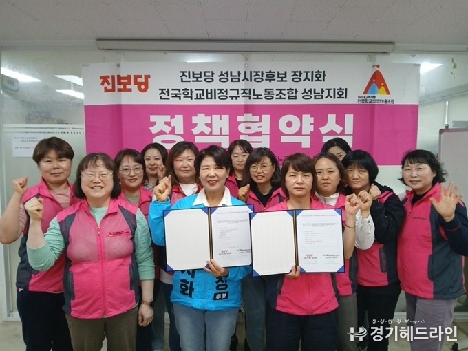 [경기헤드라인=문수철 기자] 장지화 성남시장 후보(진보당)가 전국학교비정규직노동조합 경기 성남지회와 정책협약을 맺고 학교비정규직 노동자의 처우 개선을 위한 7개 세부 공약을 제시했다. 국회에서 학교급식법 개정이 통과된 데 이어, 성남시 차원의 제도·행정 개선으로 현장 변화를 이끌겠다는 구상이다.