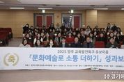 [경기헤드라인=김윤종 기자] 동두천양주교육지원청은 12월 10일, 경동대학교에서 ‘문화예술로 소통 더하기’유보이음 성과보고회를 개최했다고 밝혔다. 2024년 양주시가 교육발전특구 1차 시범지역으로 선정됨에 따라, 동두천양주교육지원청은 지역의 유아교육기관, 지자체, 대학과 협력하여 유보이음 교육과정을 공동으로 연구하고, 유치원과 어린이집을 공모를 통해 선정하여 '문화예술로 소통 더하기 '프로그램을 운영해 왔다. 이번 보고회는 지난 1년간의 결과물을 공유하는 자리로, 특히 지역내 문화예술 중심의 놀이 경험을 통해 유아의 정서적 행복감과 표현 능력을 증진시키는 데 중점을 둔 점에서 주목을 받았다. 성과보고회는 1부와 2부로 나뉘어 진행됐다. 오전 1부에서는 유보이음에 참여한 교육기관의 유아들이 국악 공연을 관람하고, 체험 부스 등을 통해 다양한 문화예술 활동을 경험했다. 오후 2부에서는 유보이음 교육과정에 선정된 유치원과 어린이집 원장 및 교사, 양주시청ㆍ교육청 관계자들이 참여한 가운데 사업 성과 보고, 교육과정 실천 사례 나눔, 발전 방향 논의 등이 이어졌다. 임정모 교육장은 “양주시 유보이음 사업은 단순한 프로그