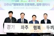[경기헤드라인=김홍량 기자] 파주시는 ㈔딜로이트한마음나눔, 행복나래㈜, 행복도시락 사회적협동조합과 함께 결식 우려가 있는 외국인 노동자 자녀 지원을 위한 ‘행복두끼 프로젝트’업무협약을 체결했다고 밝혔다. 이날 협약식에는 최병갑 파주시 부시장을 비롯해 ㈔딜로이트한마음나눔 유병문 상임이사, 행복나래㈜ 조민영 본부장, 행복도시락 사회적협동조합 최준 사무국장 등 관계자들이 참석해, 아동복지 향상을 위한 상호 협력체계를 구축하기로 뜻을 모았다. 이번 협약을 통해 파주시는 결식 우려 아동을 추천하고, ㈔딜로이트한마음나눔, 행복나래㈜와 행복도시락 사회적협동조합은 해당 아동을 대상으로 도시락을 후원·제작·배송하는 역할을 맡게 된다. 이번 협약을 계기로 파주시 내 결식이 우려되는 외국인 노동자 자녀 40명이 지원을 받게 됐으며, ‘아프리카 10개국 이주민 노동자 공동체’는 해당 아동들이 정기적으로 도시락을 제공받게 된 것에 대해 깊은 감사의 마음을 전했다. 최병갑 파주시 부시장은 “파주시가 행복두끼 프로젝트 사업에 참여하게 되어 뜻깊다”라며 “앞으로도 지역사회 내 어려움을 겪는 아동들에게 희망을 전하는 따뜻한 사업