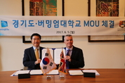 ▲ 사진왼쪽부터 이재율 행정부지사와 팀존스 버밍엄대 부총장 MOU체결하고 있다. [경기헤드라인=문수철 기자] 경기도와 영국 버밍엄대학교(University of Birmingham)가 경기도 장기 국외 훈련 선발 공무원이 버밍엄대 실무정책과정에 참여할 수 있도록 공동 지원하기로 했다. 이재율 경기도 행정1부지사는 현지시각 5일 15시 영국 버밍엄대학교에서 팀 존스(Tim Jones) 버밍엄대학교 부총장과 이런 내용을 담은 학문적 우호·교류 증진을 위한 업무협약을 체결했다. 협약에 따라 버밍엄대학교는 경기도 선발 공무원에 대해 사회정책학대학원 실무정책 과정 등 다양한 교육프로그램 참여 기회와 학습자료, 간행물 제공 등 학문적 교류를 공식적으로 지원하게 된다. 이재율 행정1부지사는 “기후변화협약 등 새로운 국제규범 설정으로 국내행정에도 국제적 기준과 절차 준수가 요구되고 있지만 국제화 역량을 갖춘 인재를 단기간에 양성하는 것은 쉽지 않다”면서 “국제화 역량을 갖춘 경기도 공무원을 양성할 수 있도록 버밍엄대학교의 많은 관심과 지원을 바란다”라고 말했다. 경기도는 국제경쟁력 강화를 위해 1994년부터 도 공무원에 대한 장기국외훈련을 실시 중이다. 그동안 약 12개국