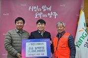 [경기헤드라인=김윤종 기자] ㈜영진스테이지는 지난 27일 양주시 남면행정복지센터를 방문해 지역 내 어려운 이웃을 위한 이웃돕기 성금 100만 원을 전달했다. 남면 상수리에 위치한 ㈜영진스테이지는 특수조명·무대기계장치·호텔 연회장 설비 등 무대기술 분야 전문기업이다. 이날 기부식에는 김동현 ㈜영진스테이지 대표, 백운구 남면장, 김영권 남면 지역사회보장협의체 공동위원장이 참석해 따뜻한 나눔의 의미를 함께 했다. 기부금은 사회복지공동모금회를 통해 남면 관내 취약계층을 위해 사용될 예정이다. 김동현 대표는 “지역에서 받은 사랑을 다시 지역에 돌려드리고 싶었다”며 “작은 도움이지만 어려운 이웃들에게 힘이 되기를 바란다”고 전했다. 백운구 남면장은 “지역 기업의 따뜻한 참여가 큰 힘이 된다”며 “소중한 성금이 꼭 필요한 분들께 전달되도록 최선을 다하겠다”고 말했다. 김영권 공동위원장 역시 “협의체는 민관이 함께 복지 사각지대를 살피고 지원하는 역할을 하고 있다”며 “이런 뜻깊은 나눔이 더 많은 이웃들에게 희망이 되기를 기대한다”고 전했다. 남면은 앞으로도 지역 기업 및 단체와의 협력을 통해 지속적
