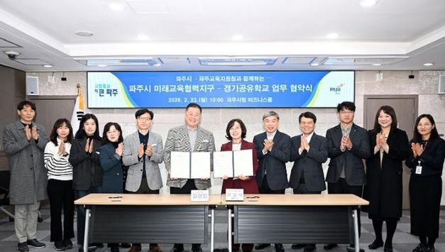 [경기헤드라인=김홍량 기자] 파주시는 지난 23일 파주교육지원청과 지역 교육 협력 강화를 위한 ‘파주시 미래교육협력지구-경기공유학교 업무협약’을 체결했다. 이번 협약은 올해 2월로 협약 기간이 종료되는 파주미래교육협력지구 사업을 경기도교육청의 교육모델인 ‘경기공유학교’ 체제와 연계함으로써 보다 체계적인 지역 중심 교육협력체계를 구축하기 위한 것이다. 협약에 따라 양 기관은 미래 인재 양성을 위한 맞춤형 교육 실현을 목표로, 향후 2년간 지역 특성을 반영한 교육 기반 시설을 구축하고 관내 학생들을 위한 위한 맞춤형 교육 프로그램을 공동 추진할 예정이다. 시는 이를 바탕으로 학교와 지역, 교육청이 긴밀히 소통하는 교육협력 기반을 강화할 방침이다. 기초학력부터 진로·진학, 미래역량 교육에 이르기까지 학생 성장의 전 과정을 체계적으로 지원함으로써 명실상부한 ‘미래교육 도시’로 도약한다는 구상이다. 또한, 양 기관은 이번 협약을 통해 올해 추진하게 될 세부사업과 예산 규모를 확정하고, 파주시만의 차별화된 교육협력 모델을 본격적으로 가동한다. 주요 사업으로는 ▲고교-대학 연계 인재 양성 ▲학생 맞춤형 진로·진학 교육 ▲중학생 창의적 체험활동 지원 ▲학교-지역 연계 교육