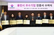 [경기헤드라인=문수철 기자] 용인특례시는 11일 시청 접견실에서 ‘2025년 용인시 우수기업 인증제’ 심의 결과 선정된 ‘올해의 우수기업’ 10개 사에 인증서를 전달했다. 이상일 용인특례시장은 이들 기업 대표와 임직원들을 만나 축하와 격려 인사를 나누고 우수기업 인증서와 현판을 전달했다. 이상일 시장은 “우리 경제가 어려운 가운데서도 기업 활동을 잘 해주셔서 우수기업으로 선정된 것을 축하드린다”며 “각자 분야에서 그동안 많은 노하우를 쌓아왔기에 경제가 어려운 가운데서도 성과를 냈고, 우리 지역 경제에도 큰 보탬이 돼 주셔서 감사드린다”고 말했다. 이 시장은 “기업 활동으로 한 가족의 가장은 힘을 얻어 가정을 잘 꾸려갈 수 있고, 신규 일자리를 찾는 사람에게는 희망을 주셨다”며 “기업인들이 활동하실 수 있도록 환경을 잘 개선해 나갈 것”이라고 했다. 시는 매년 경영 실적, 기술·품질 경쟁력, 지역사회 기여도 등 다양한 지표를 종합 평가해 지역경제 발전에 기여한 중소기업을 우수기업으로 인증하고 있다. 올해 선정된 기업은 ▲㈜대성티엠씨 ▲신명이엔씨㈜ ▲주식회사 에이드로 ▲㈜에이치에스씨엠티 ▲