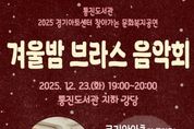 [경기헤드라인=문수철 기자] 김포시 통진도서관은 오는 12월 23일 저녁 7시부터 8시까지 다가오는 연말을 기념하여 온 가족이 함께 즐길 수 있는 브라스 음악공연을 운영한다. 이번 공연은 경기아트센터에서 지원하는 ‘찾아가는 문화복지공연’ 사업으로, 김포시 북부권 시민들을 대상으로 일상 가까이에서 문화예술을 만나는 기회를 제공하고, 지역 간 문화 격차를 완화하고자 기획했다. 이번 공연은 금관 5중주로 구성된 앙상블 코리안아츠의 풍성한 선율로 채워질 예정이며, 코리안아츠는 대한민국 국제관악제 홍보대사와 2018년 평창동계올림픽 개막식 《승리의 팡파레》를 연주하는 등 화려한 이력을 지닌 팀으로, 클래식은 물론 영화와 대중음악 등 다양한 장르를 넘나들며 새로운 음악적 시도를 이어가고 있다. 도서관 관계자는 “이번 공연은 영화 및 애니메이션 음악공연으로 누구나 쉽게 즐길 수 있으며, 이번 공연을 통해 온 가족이 따듯한 연말을 보내길 바란다”라고 말했다.