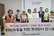 [경기헤드라인=문수철 기자] 양평군 개군면 지역사회보장협의체는 지난 29일 추석 명절을 맞아 ‘추석 명절 꾸러미 나눔’을 실천했다. 이번 사업은 관내 저소득가구 및 복지사각지대 60가구를 대상으로 진행됐으며, 송편과 삼계닭 등으로 구성된 꾸러미를 위원들이 직접 가정을 방문해 전달했다. 또한 위원들은 개군면 지역사회보장협의체 특화사업인 ‘사랑 애(愛) 농산물’ 사업으로 직접 만든 깻잎장아찌를 함께 전달하며, 나눔 문화를 확산하고 이웃 간 따뜻한 정을 나누는 시간을 가졌다. 한장희 위원장은 “추석을 앞두고 소외된 이웃들이 따뜻한 명절을 보낼 수 있기를 바라는 마음으로 준비했다”며, “앞으로도 협의체가 중심이 되어 나눔과 봉사의 문화를 확산해 나가겠다”고 전했다. 임병희 개군면장은 “명절마다 이웃들에게 정성껏 꾸러미를 배분해 주시는 협의체 위원님들께 깊이 감사드린다”며 “앞으로도 협의체와 함께 복지사각지대 해소와 따뜻한 지역공동체 조성에 힘쓰겠다”고 말했다.