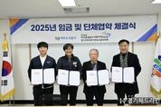 [경기헤드라인=정현수 기자] 여주도시공사와 민주노총 공공운수노조 여주도시공사지회는 12월 9일 여주도시공사 사옥에서 2025년 임금 및 단체협약 체결식을 개최했다고 밝혔다. 이번 협약은 상호 신뢰와 존중을 바탕으로 진행된 성실한 교섭의 결실로, 노사 상생과 지속 가능한 발전을 위한 중요한 발판이 될 전망이다. 공사와 노동조합은 이번 협약을 통해 직원들이 안정적인 근무여건 아래 역량을 발휘할 수 있는 환경을 조성하고, 공공기관으로서 사회적 책임을 다하기 위한 제도 개선과 협력 체계를 강화해 나갈 방침이다. 임명진 사장은 “이번 임금·단체협약은 노사 간 소통과 이해를 바탕으로 이루어낸 결실”이라며, “앞으로도 신뢰 기반의 노사 협력을 통해 시민에게 더 나은 공공서비스를 제공할 수 있도록 노력하겠다"고 밝혔다. 여주도시공사는 앞으로도 합리적인 노사관계 정착을 위해 소통과 협력을 강화하고, 시민 중심의 공기업으로서 책임과 역할을 다하기 위한 다양한 노력을 이어갈 계획이다.