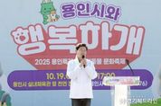 [경기헤드라인=문수철 기자] 이상일 용인특례시장은 19일 처인구 마평동의 ‘SERI PAK with 용인’ 앞 천연잔디광장에서 열린 ‘2025 용인시와 행복하개’ 축제에 참석해 반려동물 가족과 함께 소통하는 시간을 가졌다. 이번 행사는 반려동물과 시민들이 함께 어울리며 공존할 수 있는 문화를 확산하고, 유기동물 입양을 장려하기 위해 마련됐다. 이날 행사장에는 가족 단위 시민과 반려인 등 5000여 명이 방문해 축제 분위기를 함께 즐겼다. 이상일 시장은 인사말에서 “시는 매년 반려동물과 함께하는 축제를 열며 반려문화 확산과 동물복지 향상을 위해 꾸준히 노력하고 있다”며 “지난해까지 시청 광장에서 열렸던 행사를 올해는 더 좋은 환경에서 시민과 반려동물들이 축제를 즐길 수 있도록 이곳 천연잔디광장으로 옮겨 개최했다”고 말했다. 이 시장은 “용인 시민 110만명 중 25만여 명이 15만 반려동물과 함께하고 있다”며 “앞으로도 반려동물 복지증진과 시민 인식개선을 위한 정책을 지속적으로 추진해 나가겠다. 화창한 가을 날씨 속에서 반려동물과 함께 즐거운 추억 많이 남기시길 바란다”고 했다. 이 시