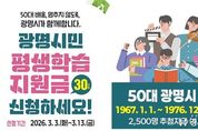[경기헤드라인=문수철 기자] 광명시가 50대 중장년 시민의 배움 기본권 보장을 위해 올해도 평생학습지원금 지원을 이어간다. 시는 오는 3월 3일부터 13일까지 11일간 ‘2026년 광명시민 평생학습지원금’ 신청을 받는다고 26일 밝혔다. 광명시민 평생학습지원금은 생애 전환기를 맞은 50대 시민이 나이·소득·배경과 관계없이 배움을 지속할 수 있도록 생애 1회 1인당 30만 원의 평생학습이용포인트를 지원하는 사업이다. 시민 스스로 자신의 삶과 필요에 맞는 학습을 선택하도록 돕는 것이 핵심 목적이다. 박승원 광명시장은 “배움은 선택이 아닌 누구에게나 보장돼야 할 기본권”이라며 “시민이 나이나 환경의 제약 없이 언제든지 배움을 이어갈 수 있도록 평생학습 기반을 더욱 탄탄히 만들어가겠다”고 밝혔다. 신청 대상은 1967년 1월 1일부터 1976년 12월 31일 사이에 출생한 50대 광명시민이다. 광명시에 1년 이상 계속 거주했거나, 거주기간을 합산해 5년 이상 거주하고 있어야 한다. 시는 총 2천500명을 선정해 지원한다. 59세(1967년생)는 올해가 마지막 지원 대상임을 고려해 우선 선정하고