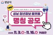 [경기헤드라인=문수철 기자] 성남시는 오는 11월 16일까지 청년 정보 플랫폼 명칭을 공모한다. 해당 플랫폼은 성남시 청년정책과 지원사업, 청년 활동 공간, 행사 정보 등을 한곳에서 손쉽게 확인할 수 있는 온라인 통합 창구로, 내년 1월 서비스 개시 예정이다. 시는 이러한 성남 청년정보 플랫폼의 목적과 기능 등을 함축적으로 표현하는 명칭을 찾는다. 성남시민 누구나 참여할 수 있으며, 1명당 1개 명칭만 응모할 수 있다. 응모하려면 네이버폼 온라인을 접속해 제안 명칭(10자 이내)과 제안 사유(15자 이상) 적어 ‘제출 버튼’을 누르면 된다. 시는 서면 심사(11.17~21), 성남시청 홈페이지를 통한 시민 선호도 온라인 투표(11.24~12.4)를 거쳐 오는 12월 10일 당선작 5점을 선정한다. 선정자에게는 최우수(1명) 50만원, 우수(2명) 각 20만 원, 장려(2명) 각 5만원 등 총 100만원의 시상금을 성남사랑상품권으로 지급한다. 시 관계자는 “청년정책의 얼굴이 될 이름을 시민이 직접 정하는 뜻깊은 과정”이라면서 “청년이 공감하고 부르기 쉬운 이름을