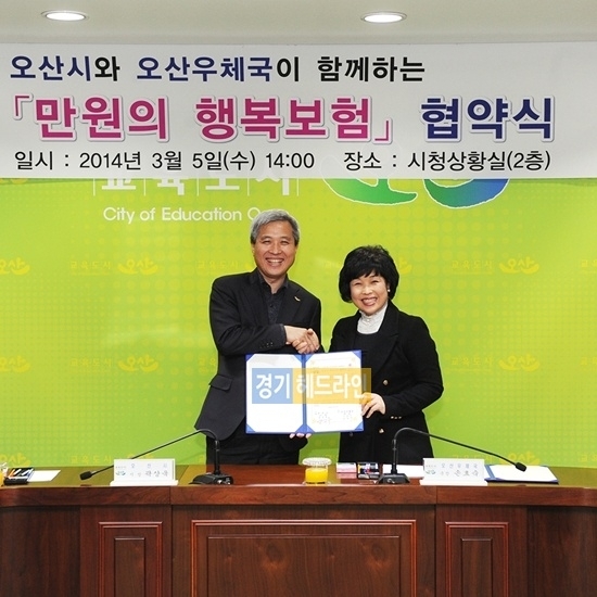 경기 오산시(시장 곽상욱)는 지난 5일 오후 시청 상황실에서 "오산우체국(국장 손효숙)과 ‘만원의 행복보험’ 지원 협약을 체결했다."고 밝혔다.