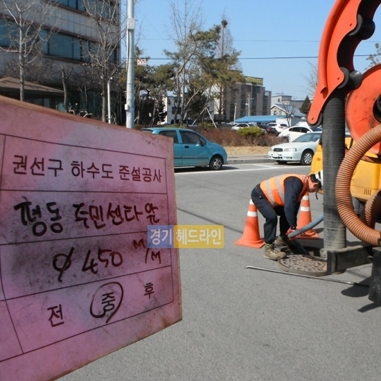 수원시 권선구(구청장 김지완)는 하수흐름에 지장을 초래하여 장마기간 집중호우 시 주택침수를 야기할 수 있는 하수관로 내 퇴적물을 제거하기 위하여 관내 하수도 준설공사를 시행하고 있다.