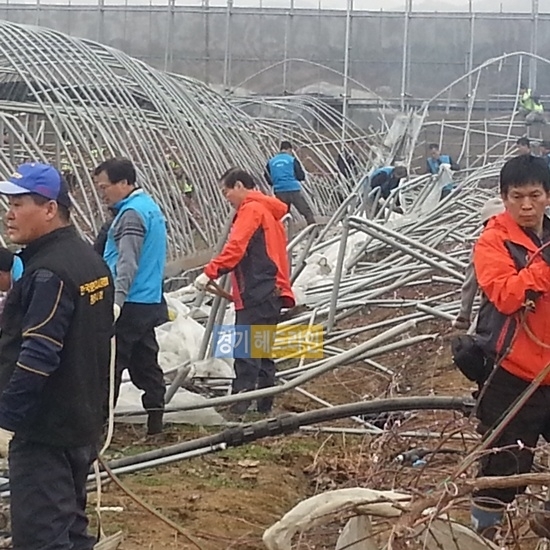 이 지역은 지난 겨울 기록적인 폭설로 인해 비닐하우스가 붕괴되는 등 큰 피해를 입은 지역이다. 이날 복구활동은 수원시 자율방재단과 강릉지역의 자원봉사 단체 등이 연계해 차량과 장비 등을 동원해 진행했다.
