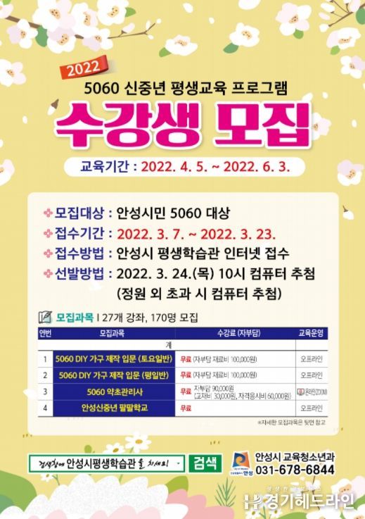 [경기헤드라인=인치덕 기자] 안성시가 이달 7일부터 23일까지 은퇴 후 새로운 인생 설계를 준비하는 5060 신중년 세대를 대상으로 ‘5060 신중년 평생교육 프로그램’ 수강생을 모집한다.
