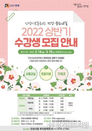 2022년 건강·문화교실은 안성시에 주소를 둔 국가보훈대상자를 대상으로 서예교실, 웃음치료, 기체조 3개 프로그램으로 운영된다. 상반기 건강·문화교실은 오는 4월 5일부터 6월 30일까지 운영되며, 3월 14일부터 16일까지 수강생을 모집한다. 신청을 원하는 자는 신분증 및 국가유공자증을 지참하여 안성시보훈회관에 방문해 신청하면 되며, 선착순 모집한다.