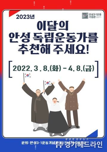 [경기헤드라인=인치덕 기자] 안성시는 2023년 ‘이달의 안성 독립운동가’를 추천 공모한다. 안성3.1운동기념관과 경기동부보훈지청이 공동으로 선정하고 있는 안성 지역의 독립운동가를 시민과 청소년 등으로부터 직접 추천을 받는다.