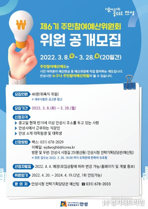 [경기헤드라인=인치덕 기자] 안성시는 예산편성 과정에 주민참여를 보장하고 예산의 투명성을 확립하기 위해 운영하고 있는 ‘주민참여예산제’를 2년간 이끌 제6기 안성시 주민참여예산위원회 위원을 오는 3월 28일까지 공개모집한다고 밝혔다.