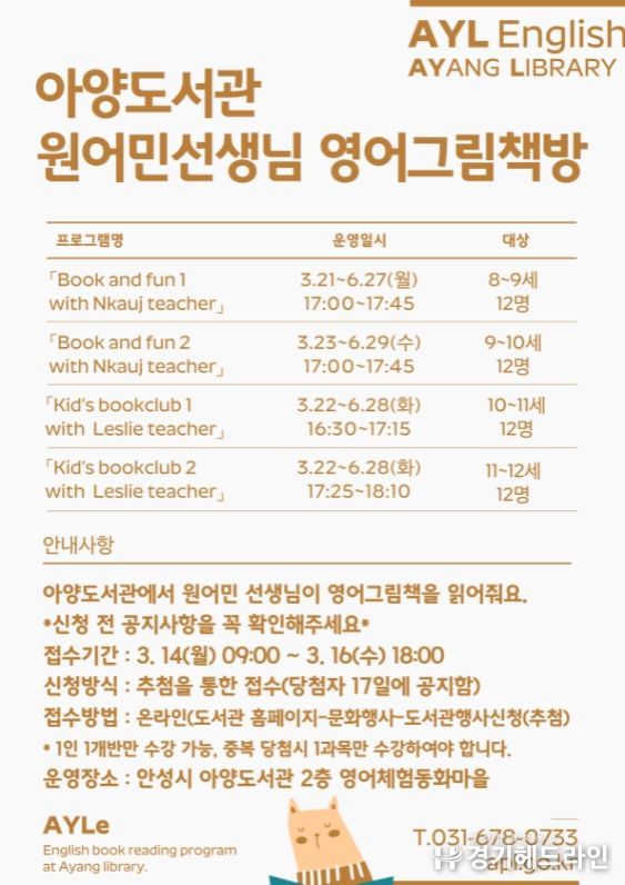 [경기헤드라인=인치덕 기자] 안성시 아양도서관에서는 초등학생을 대상으로 "AYL잉글리시-원어민선생님 영어그림책방" 참여자를 모집한다.