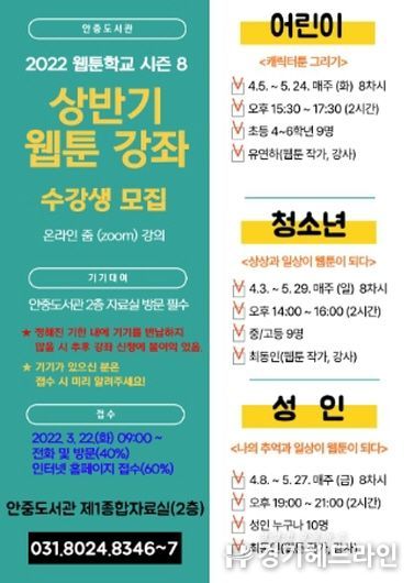 [경기헤드라인=인치덕 기자] 평택시 안중도서관은 2022년 어린이 및 청소년 겨울특강을 시작으로 '웹툰학교 시즌 8' 문을 열었다. 4월부터 진행되는 상반기 웹툰 프로그램은 어린이, 청소년, 성인을 대상 진행 예정으로 웹툰에 대한 이해를 높이고 진로탐색의 기회를 제공할 것으로 기대한다.