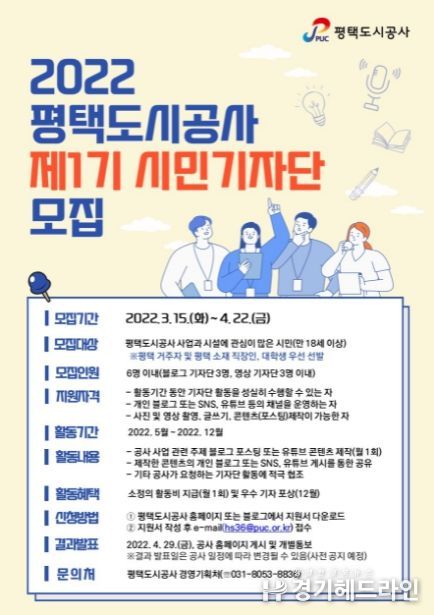[경기헤드라인=인치덕 기자] 평택도시공사가 시민과 함께하는 소통 문화 확산을 위해‘제1기 시민기자단’을 모집한다고 밝혔다.