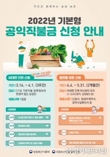 시 관계자는 “공익직불제 시행 3년 차를 맞아 올해부터 비대면 온라인 신청이 시행돼 농업인의 편의성이 높아질 것으로 기대된다. 대상자 누락과 부정수급이 없도록 사업 추진에 최선을 다하겠다”고 말했다.