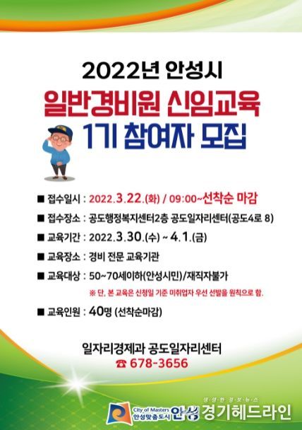 [경기헤드라인=인치덕 기자] 안성시는 오는 3월 22일부터 경비원 취업을 위한 필수 교육인 "일반경비원 신임교육" 교육생 40명을 모집한다고 밝혔다.