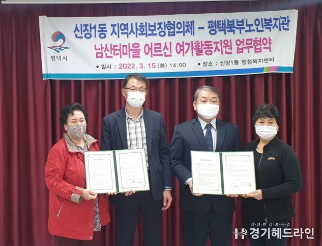 [경기헤드라인=인치덕 기자] 평택북부노인복지관(관장 김동석)은 지난 15일 신장1동 행정복지센터에서 남산터 마을 어르신 여가활동지원 사업을 추진하고자 지역사회보장협의체(공공위원장 김훈원, 민간위원장 김준숙)와 업무협약을 체결했다.