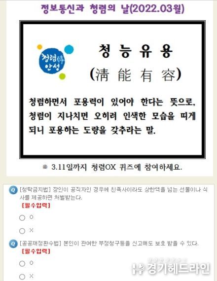 ‘청능유용(淸能有容)’, ‘부당한 이득을 얻지 말라, 그것은 손해와 같은 것이다.-헤시오도스’ 등 다양한 청렴 메시지를 공유하고, 매월 ‘청탁금지법’, ‘이해충돌방지법’ 등과 관련된 O·X 퀴즈를 풀어볼 계획이다.