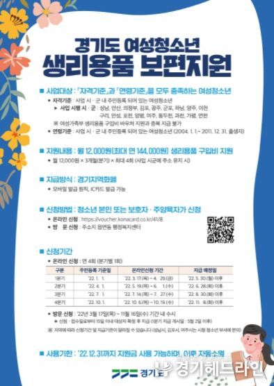 작년 하반기에 시작한 이 사업의 올해 신청대상은 2022년 1월 1일 기준 안성시에 주민등록이 되어있는 만11세 ~ 만18세(2004. 1. 1. ~ 2011. 12. 31.生) 여성청소년으로 1인당 분기별 3만6천원씩 최대 14만4천원을 경기지역화폐 모바일 카드로 지급받는다.