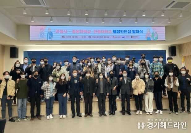 [경기헤드라인=인치덕 기자] 안성시는 지난 18일 안성시청 4층 대회의실에서 안성시 공무원 9명과 중앙대학교 학생 29명, 한경대학교 학생 3명이 참가한 가운데, 관학 협력을 통해 참신한 아이디어를 발굴하고 이를 정책으로 반영하는 2022년 상반기 대학생 행정인턴십 발대식을 개최했다.