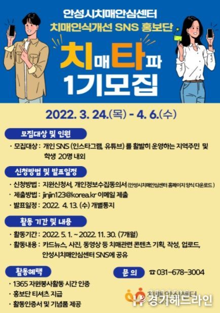 [경기헤드라인=인치덕 기자] 안성시보건소는 주민 참여형 치매인식개선 SNS 홍보단 ‘치타’ 1기 활동가 20명을 공개 모집한다고 밝혔다.