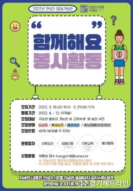 [경기헤드라인=인치덕 기자] 안성3.1운동기념관은 자원봉사 참가자를 오는 3월 29일까지 모집한다.
