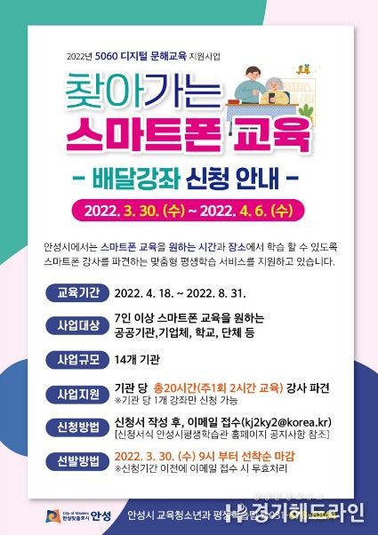 신청은 오는 3월 30일부터 선착순으로 접수하는데, 안성시청 홈페이지 또는 안성시평생학습관에서 찾아가는 스마트폰 교육 배달강좌 신청서를 작성한 뒤 이메일로 제출하면 된다.