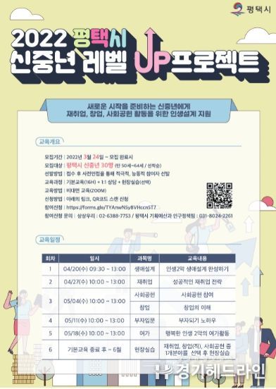[경기헤드라인=인치덕 기자] 평택시는 24일부터 은퇴 후 새로운 시작을 준비하는 신중년에게 인생설계 지원을 위한 '2022년 평택시 신중년 레벨UP 프로젝트'수강생을 모집한다.