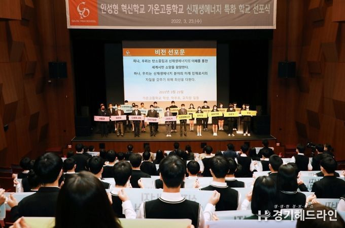 이날 참석한 안성교육지원청 김진만 교육장은 “가온고등학교의 빛깔을 발현할 수 있는 신재생에너지 특화 교육이 안성형 혁신학교 모습으로 나타나고 미래교육으로 발전되기를 바란다. 모든 학교들도 안성형 혁신학교로 도약할 수 있도록 적극적으로 지원하겠다”고 말했다.