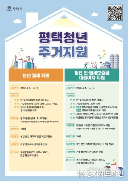 [경기헤드라인=인치덕 기자] 평택시는 청년의 주거 안정 및 지역 정착을 돕기 위한 지원정책으로 '평택청년 주거지원'사업을 오는 4월 4일부터 15일까지 2주간 거주지 관할 행정복지센터에서 신청을 받을 예정이라고 밝혔다.
