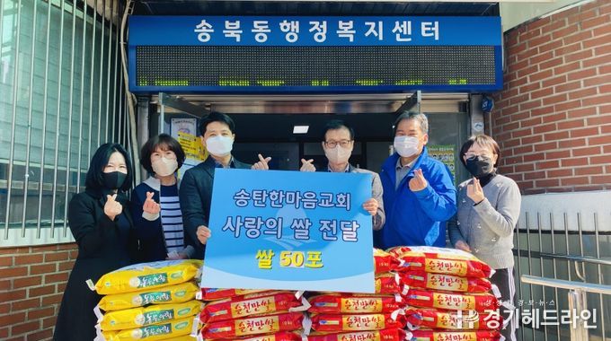 송탄한마음교회는 지난 2020년부터 매 분기 꾸준히 송북동에 백미를 기탁하는 것으로 지역사회의 이웃에 대한 사랑을 실천하고 있다.