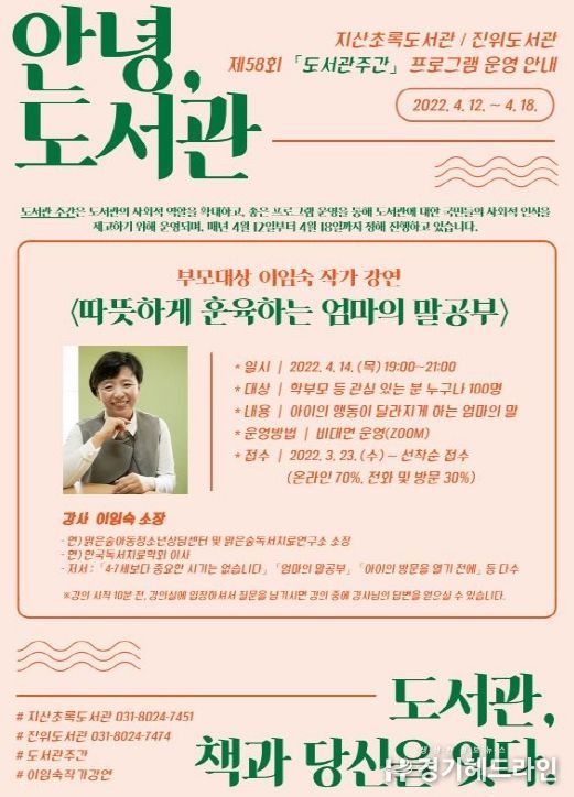 [경기헤드라인=인치덕 기자] 평택시립지산초록도서관과 진위도서관에서는 한국도서관협회에서 주최한 제58회 도서관주간(2022. 4. 12. ~ 4. 18.)을 맞아 다양한 프로그램을 운영할 예정이다.