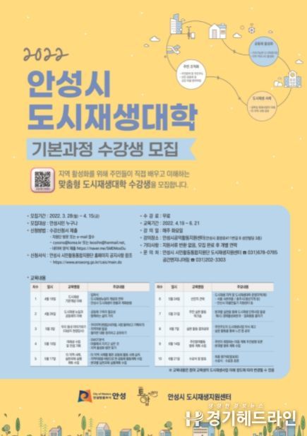 [경기헤드라인=인치덕 기자] 안성시 시민활동통합지원단 도시재생지원센터는 지난 28일부터 오는 4월 15일까지 "2022년 안성시 도시재생대학" 수강생을 모집한다.