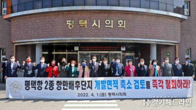 평택시의회는 1일 시의회 본관 앞에서 의원 16명 전원이 참여한 가운데 ‘평택항 2종 항만배후단지 기존개발면적 유지 건의’ 성명서를 발표했다.