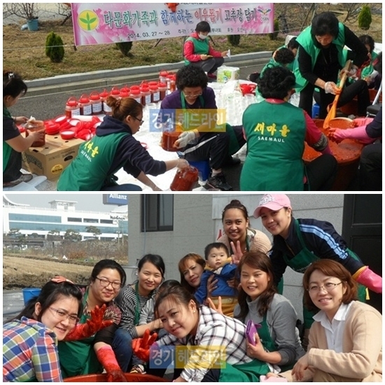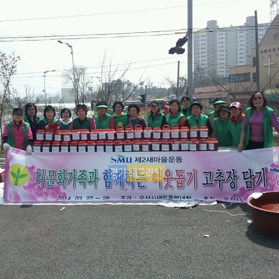 경기 오산시 새마을부녀회(회장 유혜숙)는 지난 3월 28일 새마을회관 주차장에서 다문화가정을 초청해 전통재래 고추장 담그기 행사를 가졌다.
