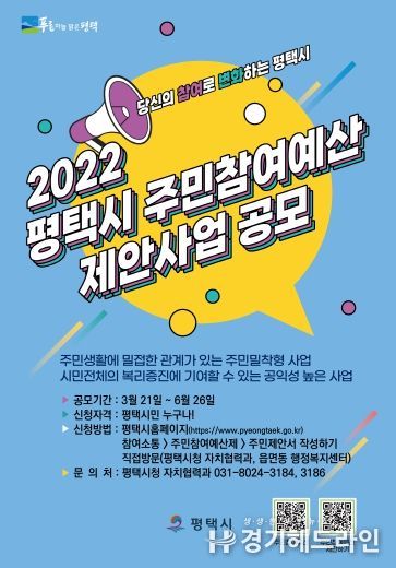 [경기헤드라인=인치덕 기자] 평택시가 지난 3월 21일부터 오는 6월 26일까지 최대 63억 규모로 2023년 예산편성을 위한 2022년도 주민참여예산 주민제안사업 공모 접수를 진행한다.