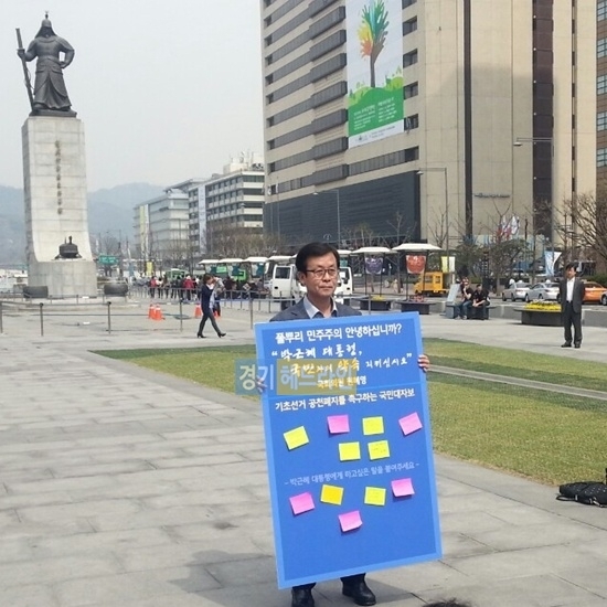 새정치민주연합 경기도지사 출마를 선언한 원혜영 의원은 오늘부터 광화문 이순신 장군 동상 앞에서 ‘기초선거 정당공천 폐지 공약 이행 촉구 1인 시위’를 벌인다.