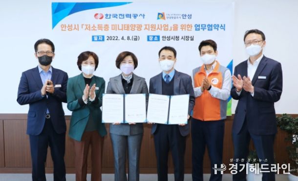 이번 협약은 안성시가 추진하는 저소득층 대상 미니태양광 설치 지원사업에 한국전력공사 안성지사가 사회공헌사업으로 참여를 제안함에 따라 진행됐다.